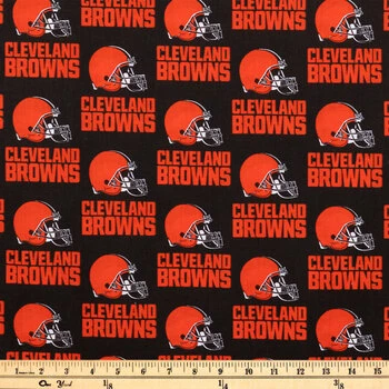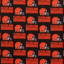 Jump into the Dawg Pound and cheer on your favorite team with the help of this Cleveland Browns Cotton Fabric! This American-made fabric has a dark brown background with burnt orange “Cleveland Browns” text and logoless helmets. It’s perfect for fans of the NFL team! Use it to create fan-tastic wearables and accents to show your team spirit.