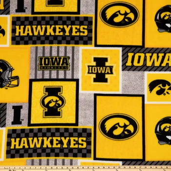Show your school spirit with a fan-centric fabric using Iowa Block Collegiate Fleece Fabric. Featuring the Iowa team logo and mascot, football helmets, and blocks of the gold and black school colors with a variety of interesting patterns within, this fabric is perfect for turning into myriad spirited fabric creations! Go team!
