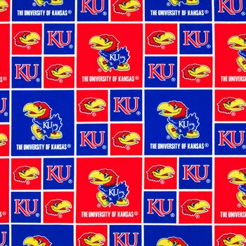 Channel your sporty side with a handmade creation made from Kansas Block Collegiate Cotton Fabric! This cool fabric offers University of Kansas Jayhawks logos and mascots on a red and blue block background. It’s perfect for creating scarves, decorations, accessories, and more!