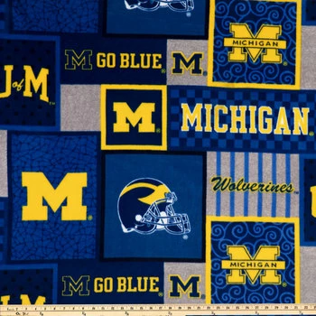 Put your game face on! Use Michigan Block Collegiate Fleece Fabric to make a variety of spirited accessories to showcase your favorite team! This warm and comfy fabric features a yellow and blue block design with University of Michigan logos and team names, football helmets, and a variety of patterns within each block. It’s the perfect medium to show off your dedication to the team!