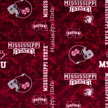 Be a super-fan with super fun and fuzzy wearables made using this Mississippi State Allover Collegiate Fleece Fabric! This maroon and white material has a digital camouflage background with text, logos, and football helmet designs. Cut it to size for blankets, flags, and more.ย You’ll be unmistakable in the stands as Mississippi’s biggest fans!