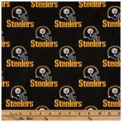 Sew something spirited with this NFL Cincinnati Bengals Cotton Fabric! This American-made black fabric is covered in logos for the NFL team from Cincinnati. The orange and black striped football helmets match the letter “B,” and there is white text that says “Cincinnati Bengals.” Turn this fabric into bandanas, flags, and other accessories you can wear as you root for your favorite team!
