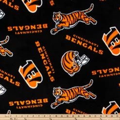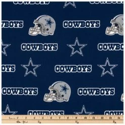 Touchdown! Score big in fan-centric wearables with NFL Denver Broncos Fleece Fabric! Featuring a repeating pattern of Broncos logos and orange and white text against a dark blue background, this soft fabric is perfect for creating colorful and spirited hats, scarves, blankets, and more!ย