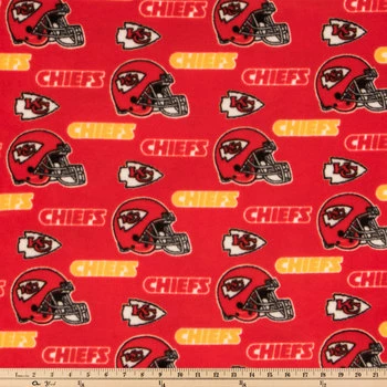 Score big in fan-centric wearables and home accents with NFL Kansas City Chiefs Fleece Fabric. Featuring a repeating pattern of Chiefs logos and red and gold text against a red background, this soft fabric is perfect for creating colorful and spirited hats, scarves, blankets, and more!