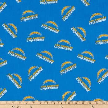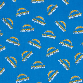 Cheer on your favorites through customized accessories cut from NFL Los Angeles Chargers Cotton Fabric. This fabric offers a light blue background, yellow and white lettering, and a yellow, arched lightning bolt logo perched above the team’s name. Use it to make blankets, clothes, and more to electrify your team spirit!