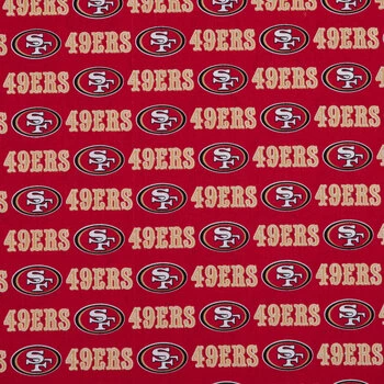 Cheer your favorites on to victory with items that have been made with this NFL San Francisco 49ers Cotton Fabric. This red material features gold and white lettering and oval-shaped emblems that boast white, black, and gold borders that surround white and black letters. Use it as the foundation for a wide range of creations to get yourself prepared for the next big game!