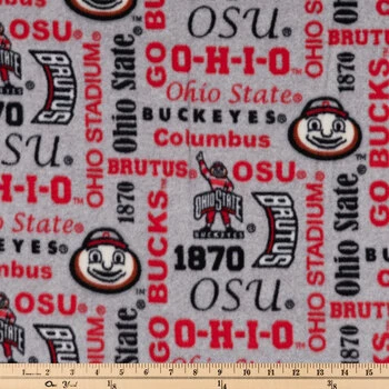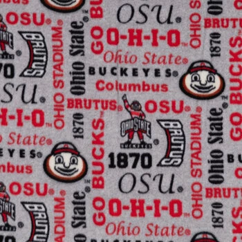 Get sporty with your creations! Ohio State Allover Collegiate Fleece Fabric features a gray background with red, black, and white Ohio State logos and phrases. This fabric will make great throws, robes, decor, and more. Go team go!