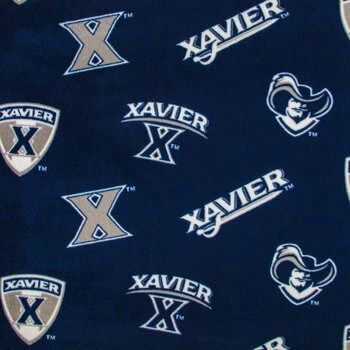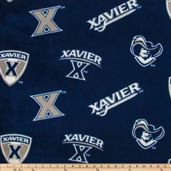 Showcase your love for Xavier University sports by crafting with Xavier Allover Collegiate Fleece Fabric. This Ohio team sport fabric features a navy blue background printed with repeating images of the Xavier “x”, a logo with a sword, a logo with a shield, and the face of a musketeer, all of which are displayed in gray and white colors. Use this fabric to make spirited pillows and blankets to sport a home or the games.